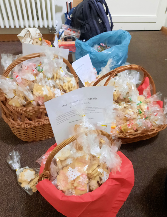 Nach etwa drei Stunden hatten wir 150 Plätzchentüten gefüllt. Die Tüten wurden in Körben verstaut und an die Pforten der einzelnen Häuser verteilt, sodass sich jede*r, der vorbeikommt, etwas für Zuhause mitnehmen kann.